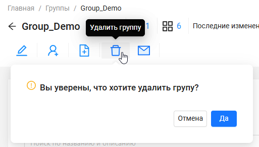 Администратор может удалить группу пользователей, если она больше не актуальна. При удалении группы, пользователи не затрагиваются и не удаляются из системы.