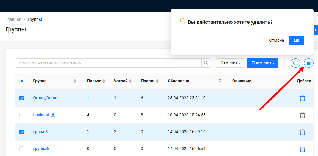 Администратор может выполнить массовое удаление групп, для этого необходимо в списке отметить нужные группы галочками и нажать кнопку «Удалить».