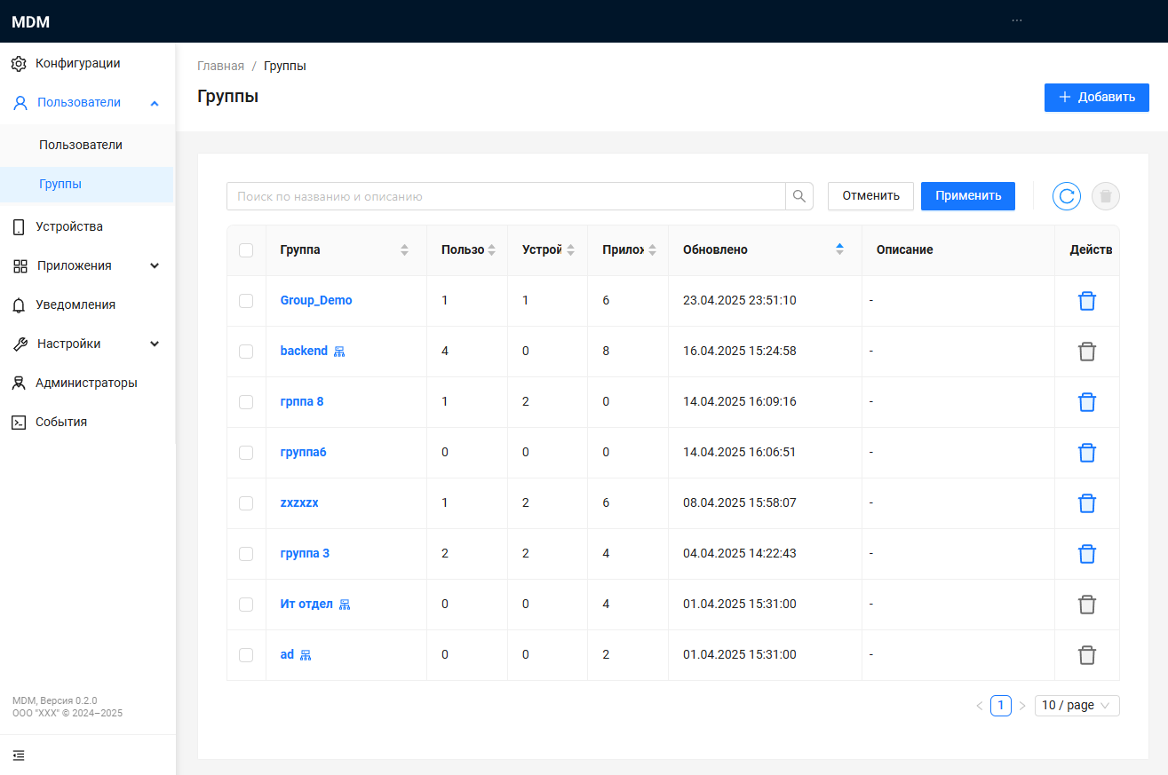В разделе Пользователи - Группы отображается перечень всех созданных в системе групп. Из этого списка Администратор имеет возможность открыть страницу с подробной информацией о группе, а также удалить группу.