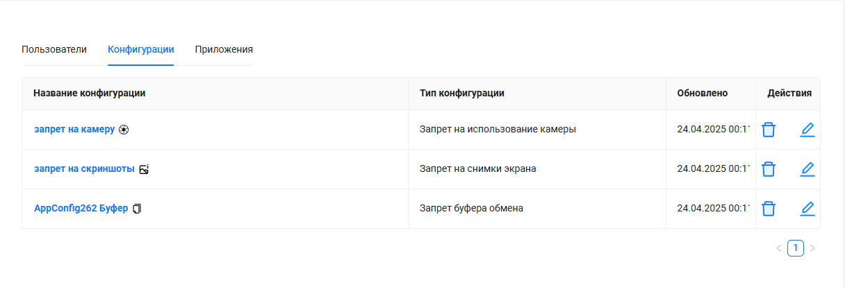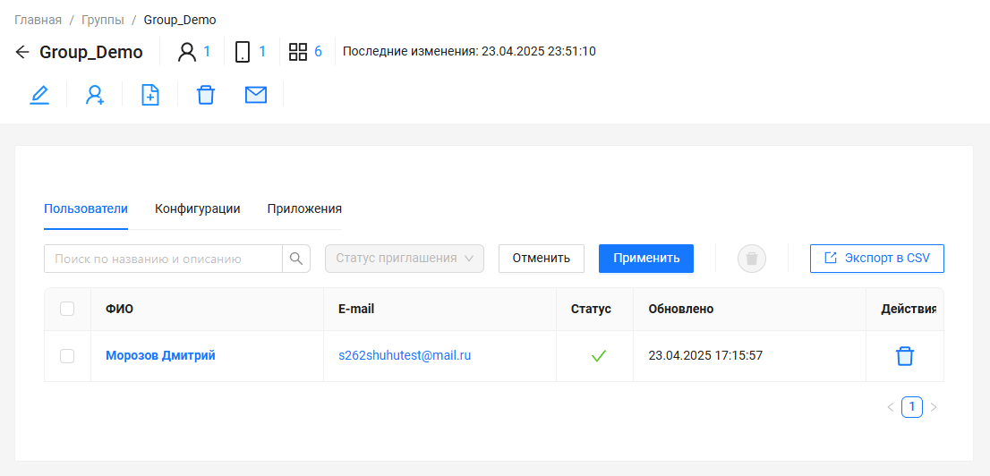 Во вкладке отображаются конфигурации добавленные к группе. Администратору доступные следующие действия: