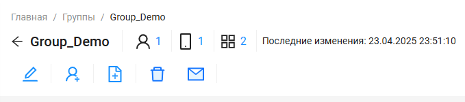 На панели управления отображается основная информация о группе: название, количество пользователей, устройств и приложений в группе.