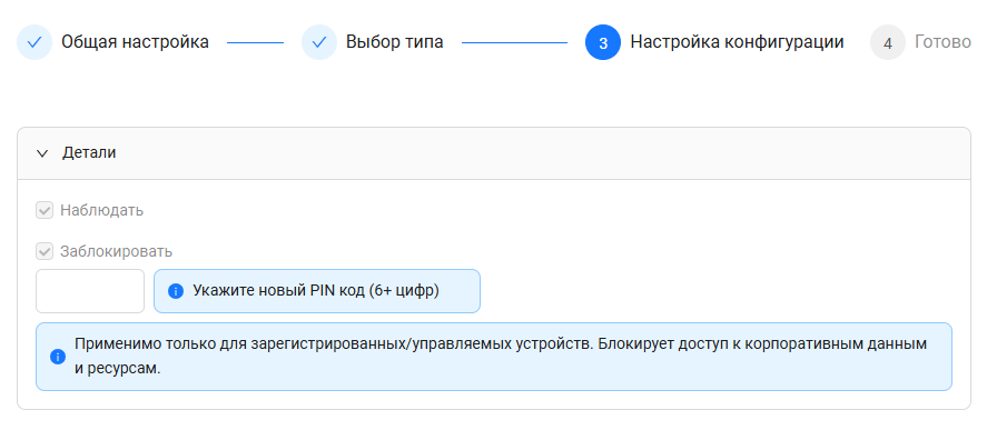 Остальные правила Защита данных, MDM отключен, Устройство вне связи, имеют одинаковые действия при нарушении политики: устройство или рабочий профиль блокируется, аналогично ручной блокировке.